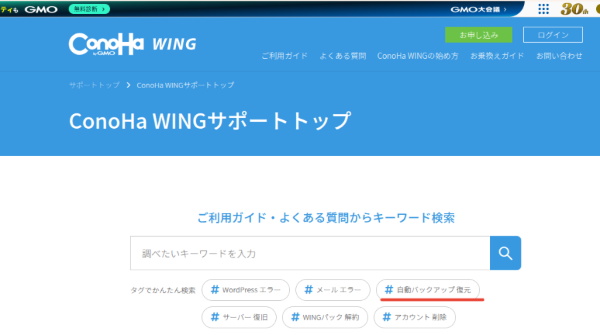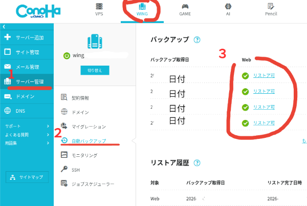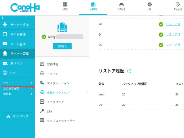 どうやらレンタルサーバーのConohaWingにバックアップデータがあるらしい。