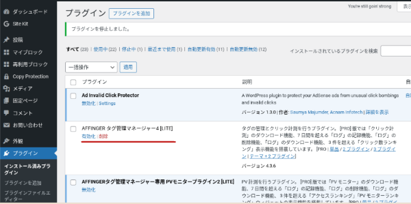 そして、不具合の引き金になったであろうプラグインを削除しました。