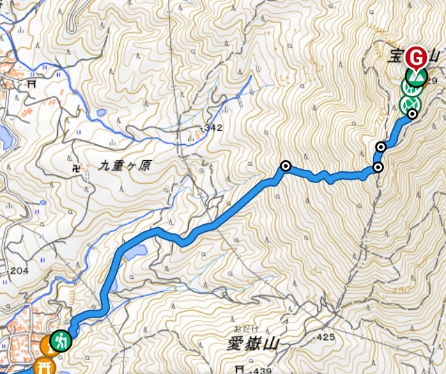 - 登山口から頂上まで運動不足のおじさんの足で2時間