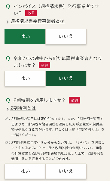 とりあえず「2割特例」はいいえで。