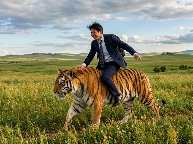 物事にはずみがついて、途中でやめられなくなるたとえ。やめるにやめられず、がむしゃらに突き進むほかはない形容。由来 いったんトラの背に乗ってしまった者は勢いも激しく、途中で降りれば食われるので、もはや降りられない意から。〈『隋書』〉