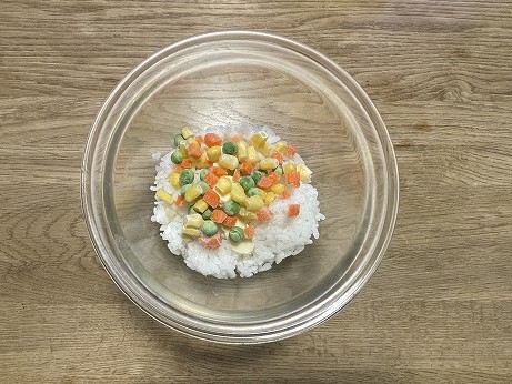 - ごはんとバターとミックスベジタブルを耐熱ボールへ入れる