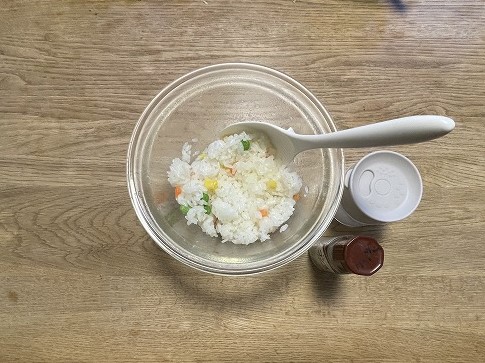 - 加熱後ごはんとミックスベジタブルを混ぜて塩コショウで味を調整