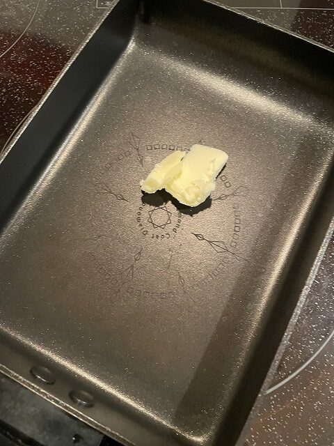 - フライパンにバターを塗る