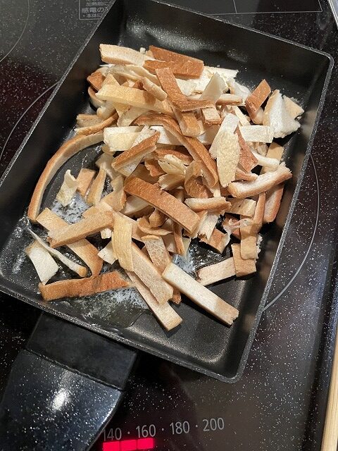 溶けてきたらパンの耳をフライパンに投入。