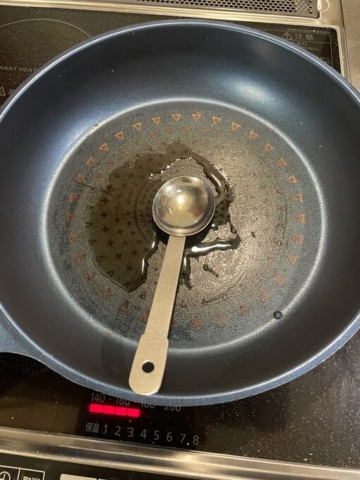 フライパンを中火で加熱後、油を大さじ1杯入れます。