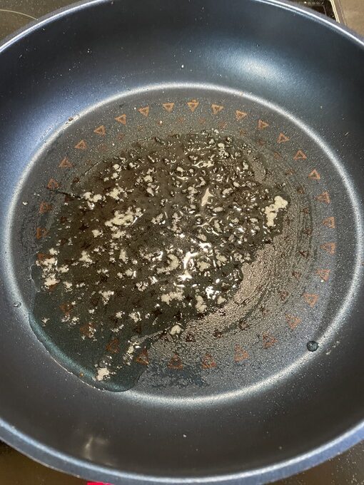 パンの耳をフライパンで油とニンニクに絡めてカリカリに焼く。
