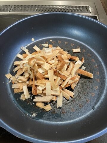 塩コショウをかけて、混ぜながらカリカリになるように炒めます。