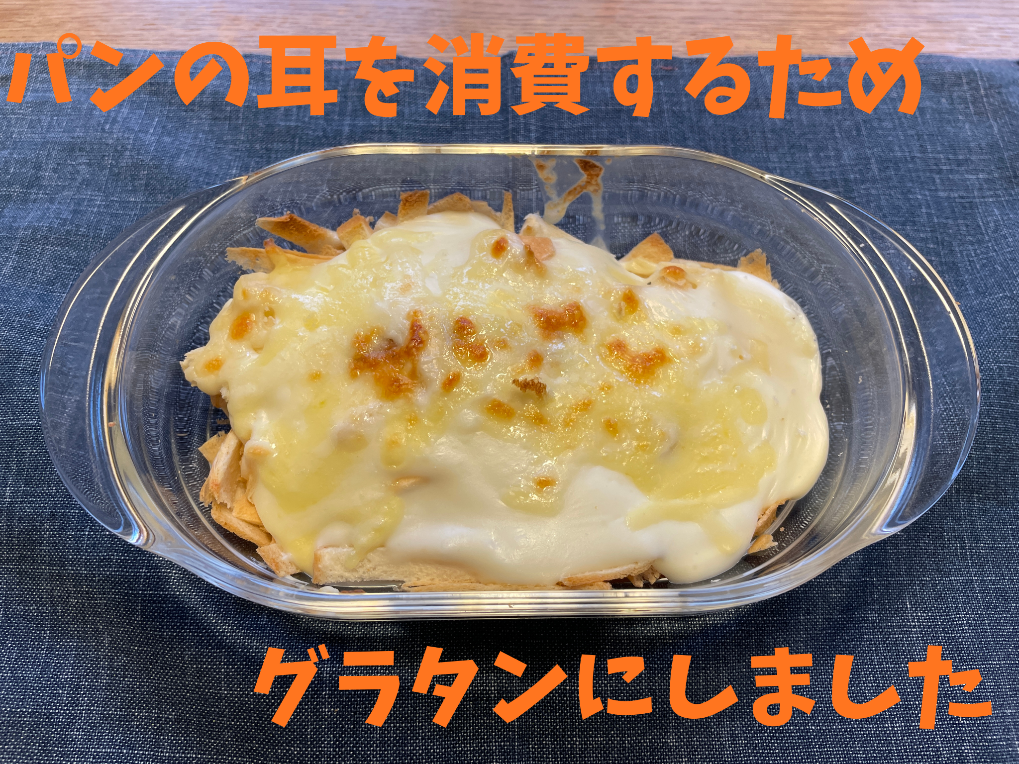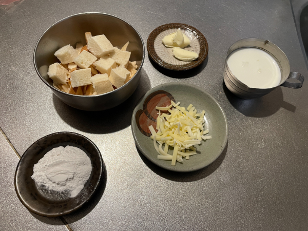 パンの耳にシュレッドチーズとホワイトソースをかけて。