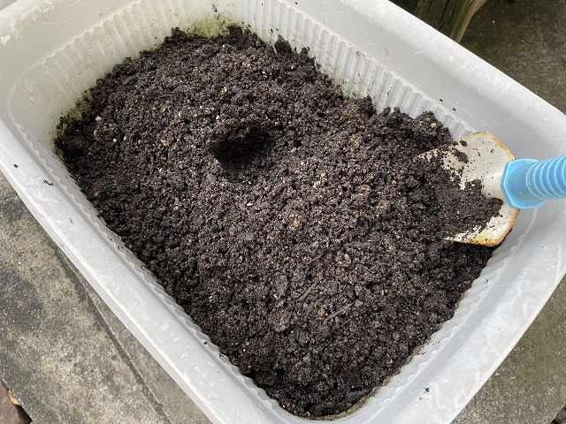 大きなプランターに一応畝(うね)らしきものを作ります。