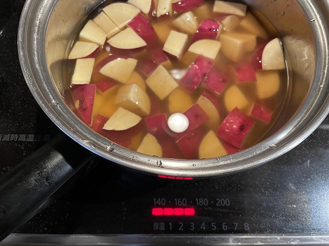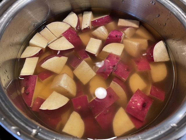 水を2カップ入れます。鍋の中でさつまいもがひたひたになる程度です。