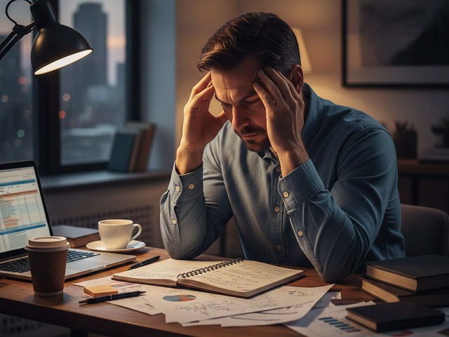 例えば、「悩んでいる男性 デスクで考え事」とお願いしますと